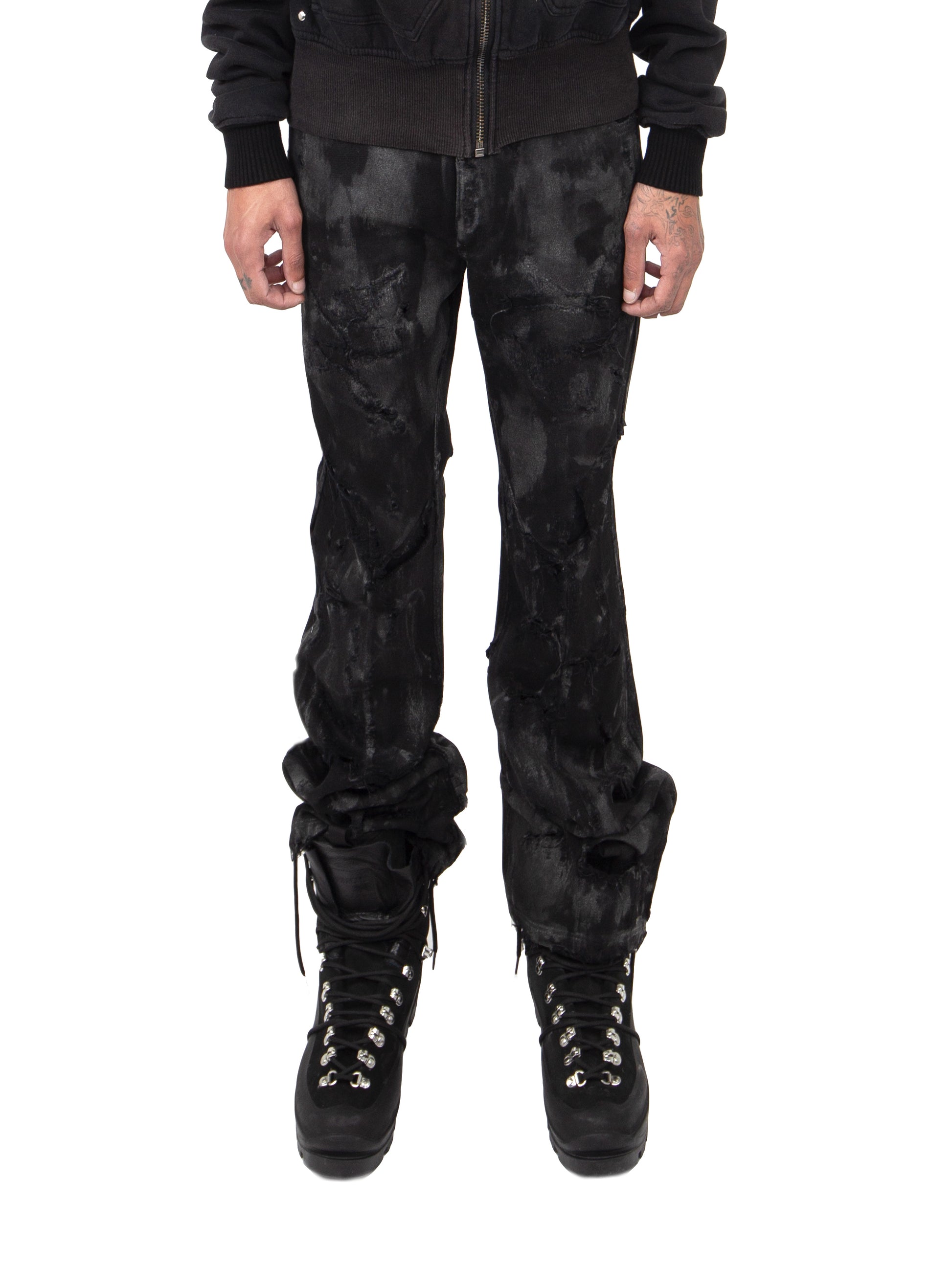 "BLACK FLARED WAXED DENIM"